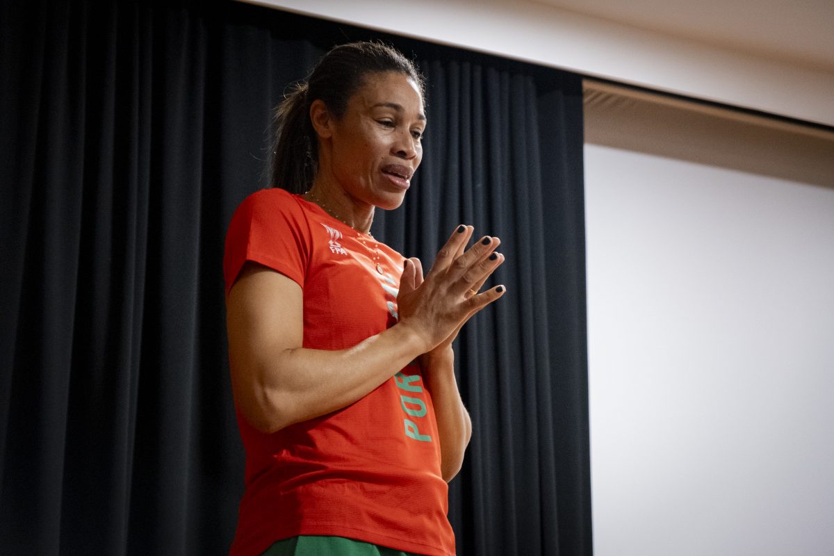 A campeã mundial de pentatlo e recordista nacional de salto em comprimento enfatizou a importância da partilha de experiências e da humildade no processo de crescimento desportivo assim como na partilha de estratégias mentais e técnicas.