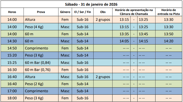 No escalão Sub-14, os masculinos competem nos 60 metros, lançamento do peso (3 kg) e salto em comprimento, enquanto as femininas alinham nos 60 metros, salto em comprimento e lançamento do peso (2 kg). Já no escalão Sub-16, os masculinos vão fazer lançamento do peso (4kg), 60 metros barreiras e salto em altura, ao passo que as femininas disputam o salto em altura, os 60 metros barreiras e o lançamento do peso (3 kg), como última prova do dia.