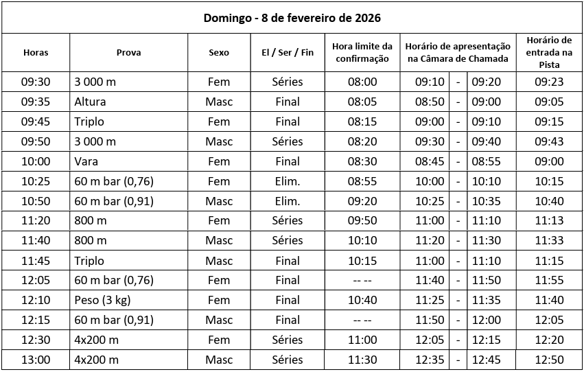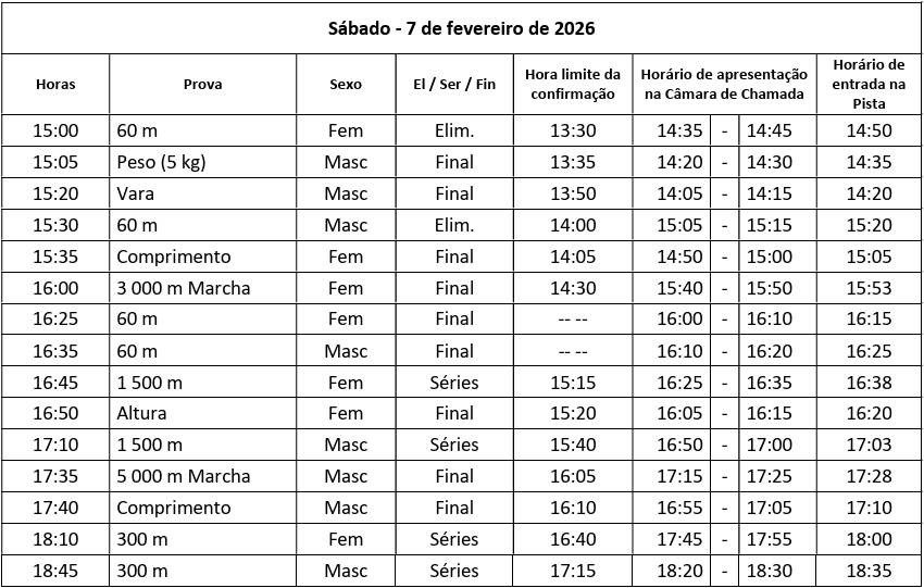 O começo está definido para as 15 horas de sábado, com os 60 metros livres femininos, com fim previsto às 13 horas do dia seguinte, com as estafetas masculinas 4×200 metros.