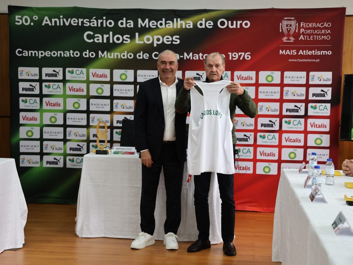 A Federação Portuguesa de Atletismo acolheu, na emblemática Sala Carlos Lopes, na sua sede, a cerimónia evocativa dos 50 anos da primeira medalha de ouro conquistada por Carlos Lopes, alcançada no Campeonato do Mundo de Corta-Mato, em Chepstow, no País de Gales.