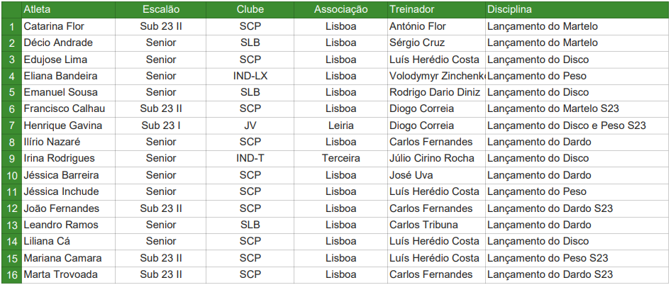 Para representar Portugal na Taça da Europa de Lançamentos, que se vai realizar em Nicósia, Chipre, dos dias 14 e 15 de março de 2026, a FPA convoca os seguintes atletas: