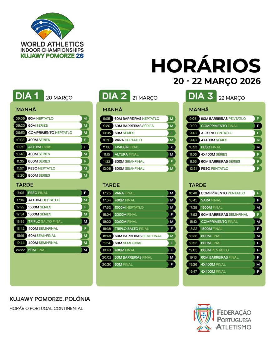 O Campeonato do Mundo de Pista Curta Kujawy-Pomorze 2026 realiza-se na Arena Torún, um palco já bem conhecido do atletismo nacional e internacional. Esta edição marca um momento de afirmação para Portugal, que apresenta a sua maior comitiva de sempre nesta competição, superando as participações anteriores e demonstrando a vitalidade do atletismo nacional em diversas disciplinas, desde a velocidade aos saltos e lançamentos.