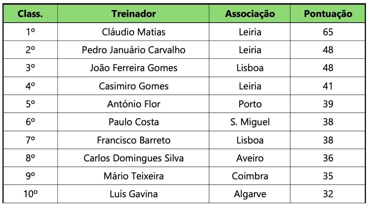 Cláudio Matias conquistou o primeiro lugar do ranking com 65 pontos, seguido por Pedro Januário Carvalho e João Ferreira Gomes, ambos com 48 pontos, confirmando o impacto destes treinadores no panorama do atletismo nacional. No total, foram reconhecidos 56 treinadores, sendo que a tabela abaixo apresenta o Top-10 da classificação final.