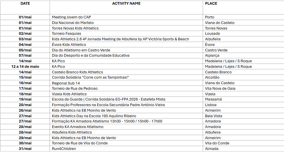 - Questionário FPA: Preenche o pequeno formulário da Federação Portuguesa de Atletismo para que possamos divulgar o teu evento no nosso site e integrá-lo no calendário nacional. Atividades KIDs ATHLETICs PORTUGAL